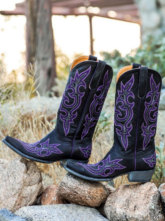 Black Embroidery Snip-Toe Wide Mid Calf Tall Cowboy Boots For Women