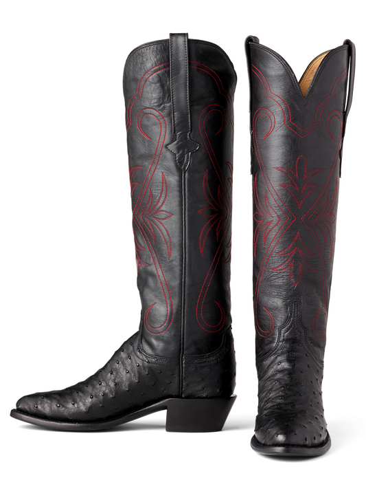 Black Almond-Toe Full Quill Ostrich Embroidery Wide Calf Knee High Tall Western Boots For Women