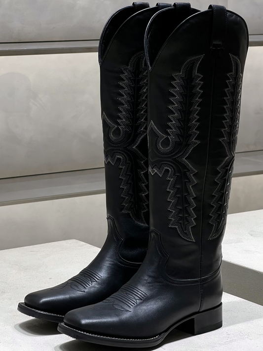 Black Embroidery Square-Toe Wide Mid Calf Tall Cowgirl Boots