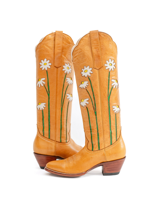 Orange Almond-Toe Wide Calf Western Boots Knee High Tall Boots With Floral Inlay