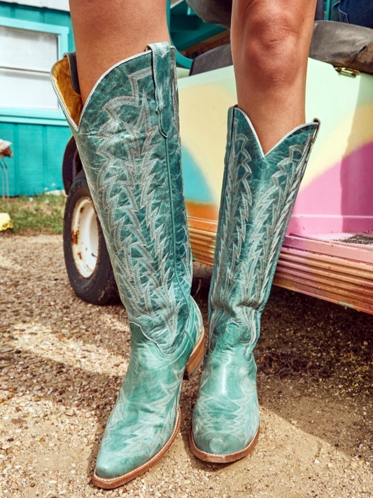 Distressed Turquoise Leaf Embroidery Wide Calf Knee High Tall Boots