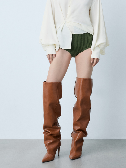 Brown Pointed-Toe Pleat Tall Wide Calf Over-The-Knee Stiletto Boots
