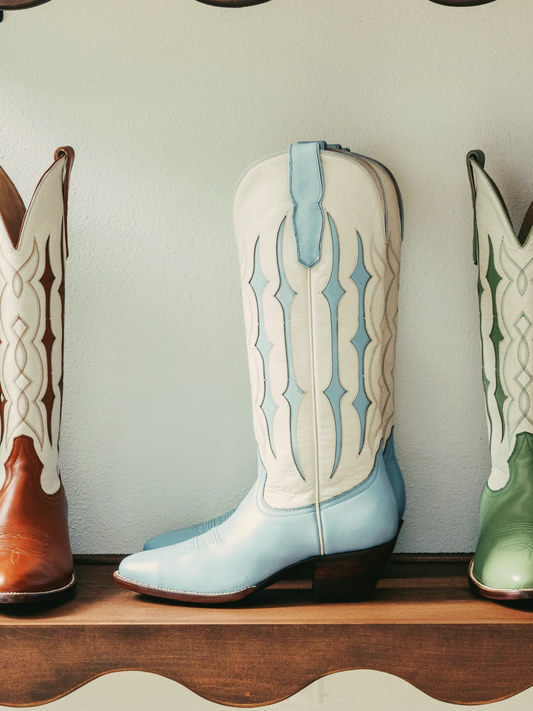 Baby Blue Contrast Inlay Stitch Almond-Toe Wide Knee High Western Cowgirl Boots