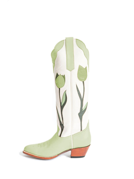 Contrast Green And Ivory Almond-Toe Tulip Inlay Wide Calf Knee High Cowgirl Boots