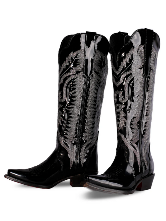 Black Patent Embroidery Snip-Toe Wide Calf Knee High Cowgirl Boots