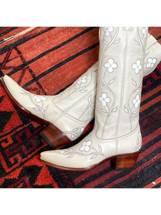 Bone Pointed-Toe White Floral Inlay Wide Calf Tall Knee High Cowgirl Boots