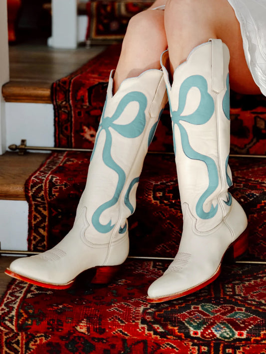 White Almond-Toe Wide Calf Western Boots Knee High Tall Boots With Green Bowknot Inlay