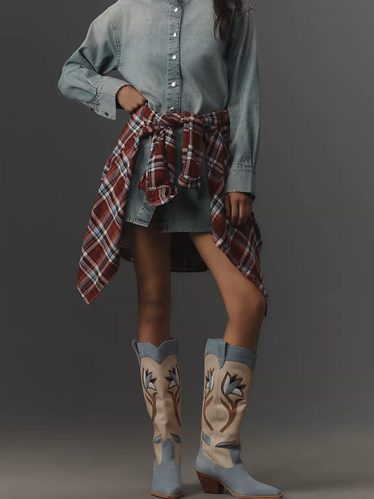 Contrast Bone And Blue Faux Suede Snip-Toe Flower Inlay Wide Calf Knee High Cowgirl Boots