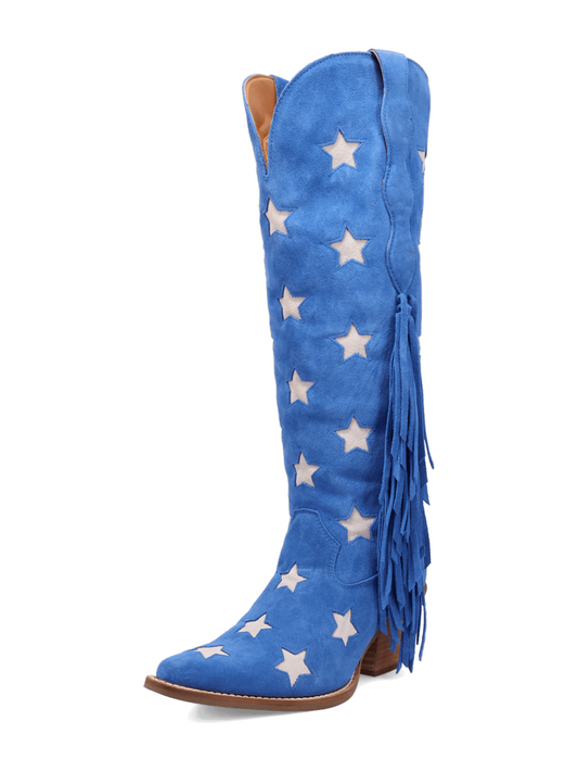 White Crinkle Star Studs Blue Inlay Fringe Snip-Toe Wide Calf Knee High Tall Cowgirl Boots