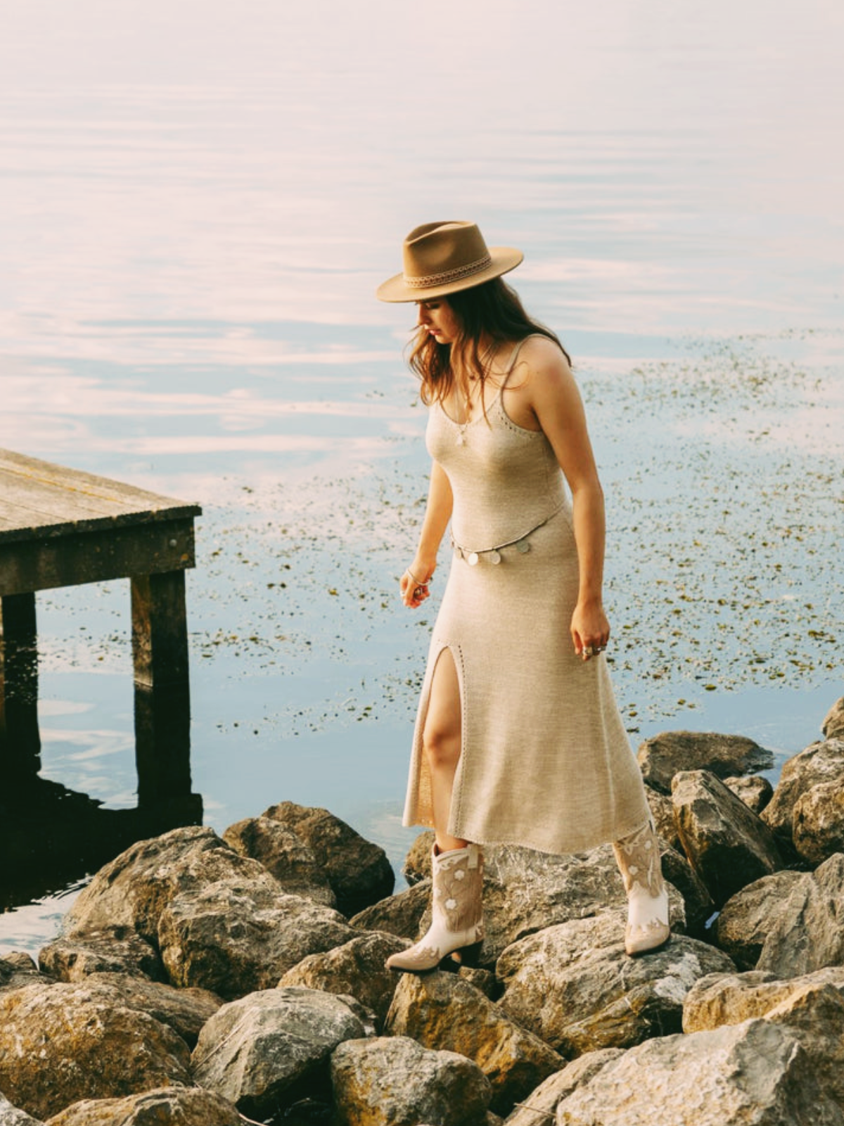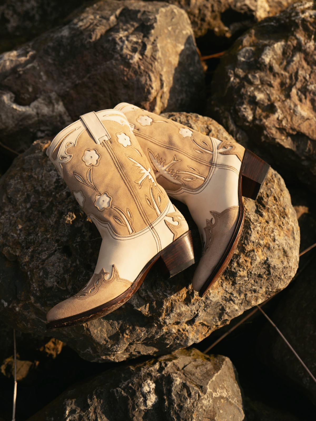 These boots boast a unique design. The tan faux suede sections exude warmth and elegance, while the ivory vegan leather parts offer a fresh, refined touch. The pointed toe enhances the leg lines, and the wide-calf design accommodates various leg shapes. Particularly eye-catching is the floral and bird inlay on the boot's surface, adding warmth and femininity, and evoking a sense of natural freshness and beauty with every step.