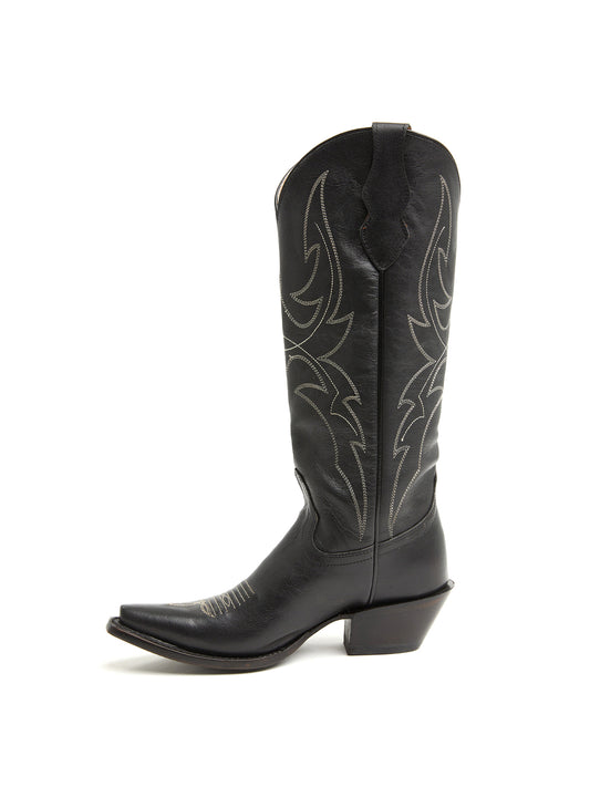 Black Snip-Toe Embroidery Classic Wide Calf Knee High Cowgirl Boots