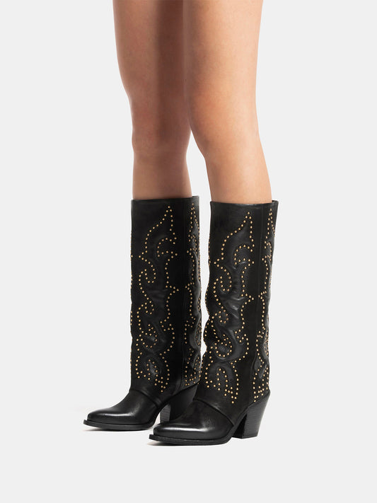 Black Snip-Toe Embroidery Gold Studs Wide Calf Knee High Cowgirl Boots