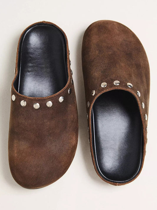 Brown Faux Suede Square-Toe Studded Backless Slip-On Flats