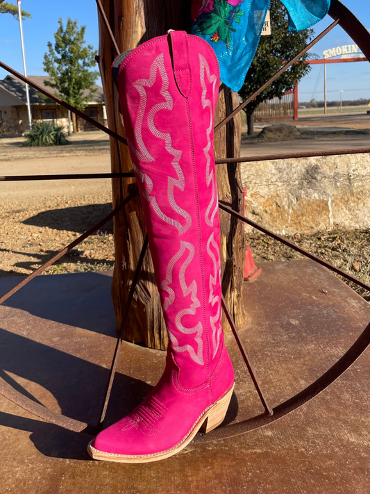 Fuchsia Faux Suede Embroidery Pointed-Toe Half-Zip Over-The-Knee Cowgirl Boots
