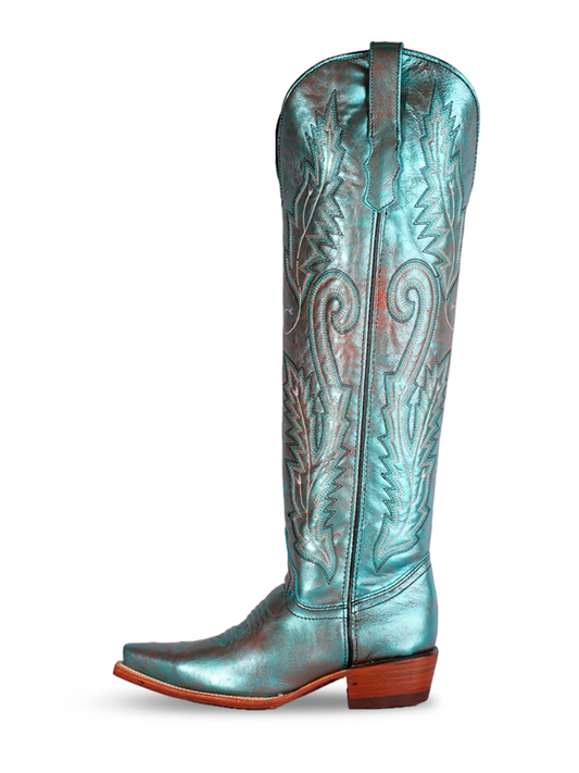 Metallic Turquoise Snip-Toe Leaf Embroidery Half-Zip Over-The-Knee Cowgirl Boots
