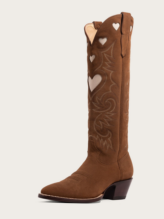 Ivory Heart Inlay Embroidery Almond-Toe Knee High Wide Calf Cowgirl Boots - Brown Faux Suede
