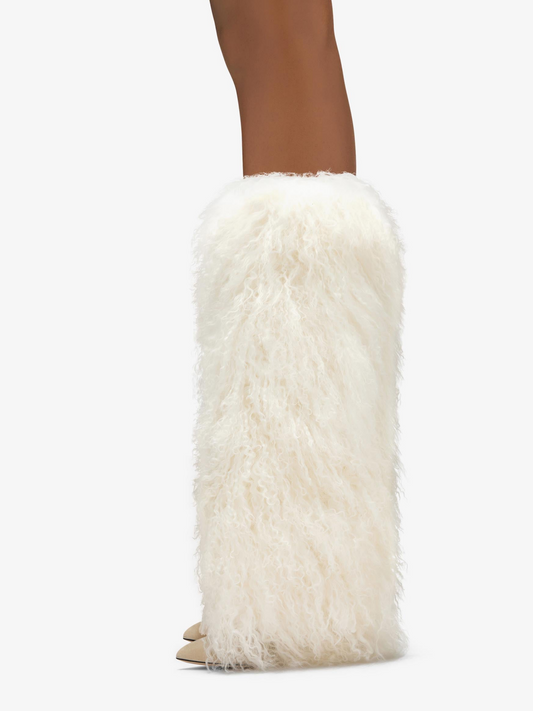 Plush And Faux Suede Pointed-Toe Wide Mid Calf Barrel Shaft Stiletto Boots - White
