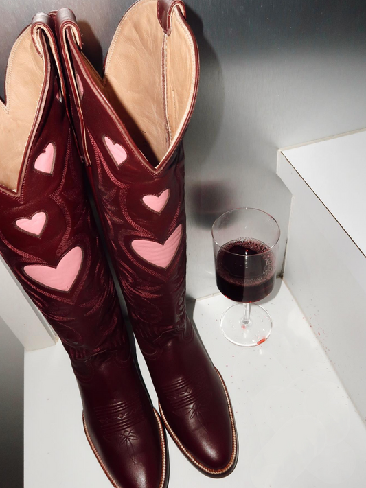 Pink Heart Inlay Embroidered Wide Calf Cowgirl Tall Boots In Dark Burgundy