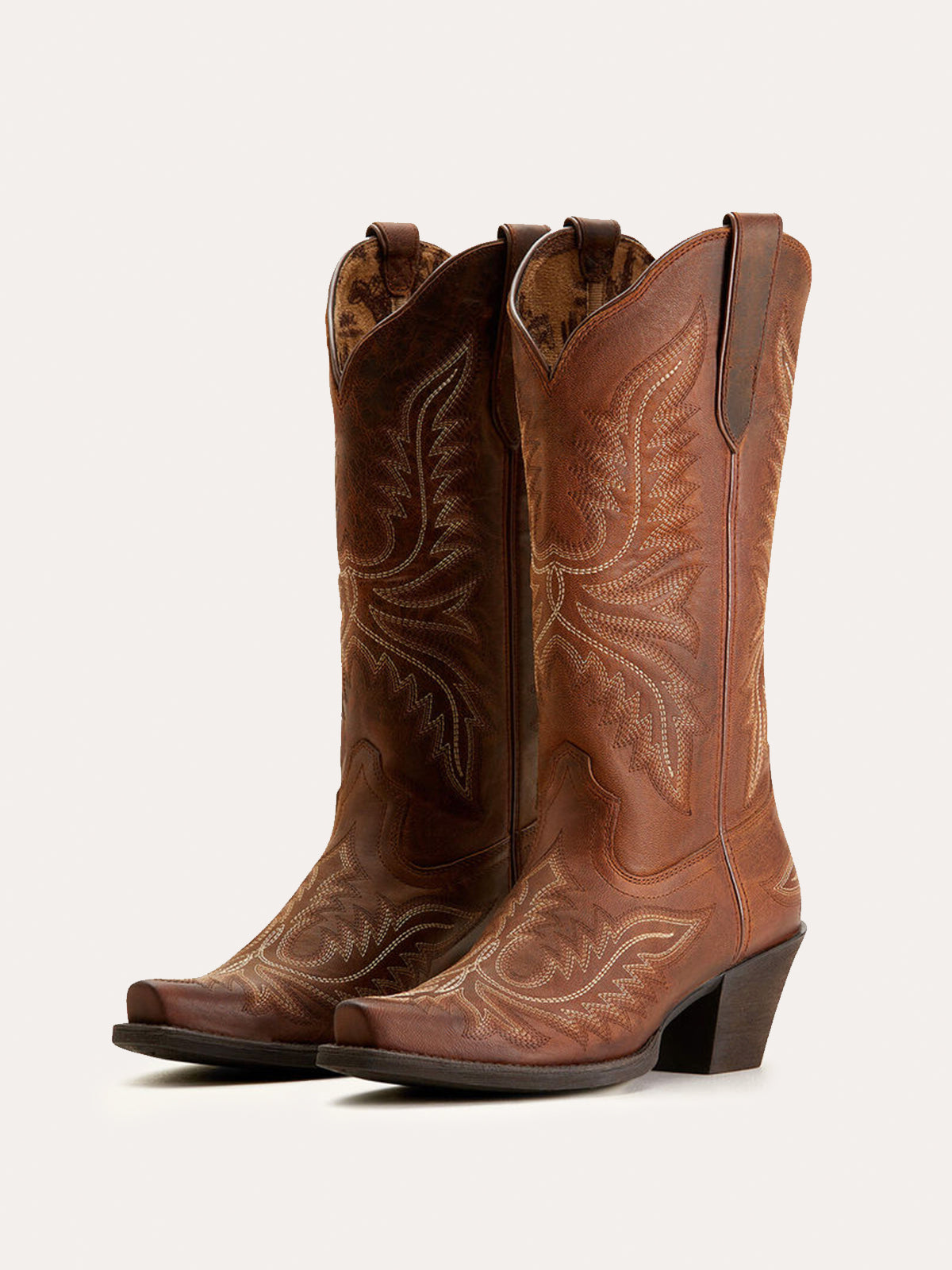 Dark Tan Snip-Toe Western Embroidery Wide Mid Calf Cowgirl Boots For Women