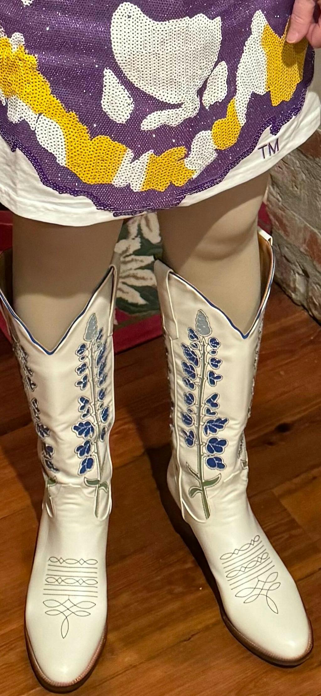 Step into a field of wildflowers with these boots. The soft ivory hue evokes the delicate petals of a spring bloom, while the stunning bluebonnet inlays dance across the shaft, bringing the spirit of the Texas countryside to life.