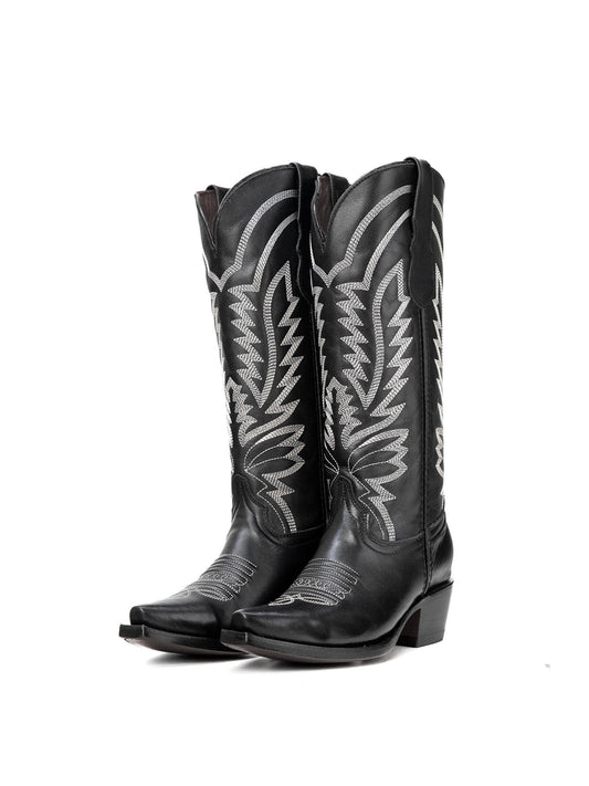 Black Snip-Toe Western Classic Embroidery Mid Calf Cowgirl Boots