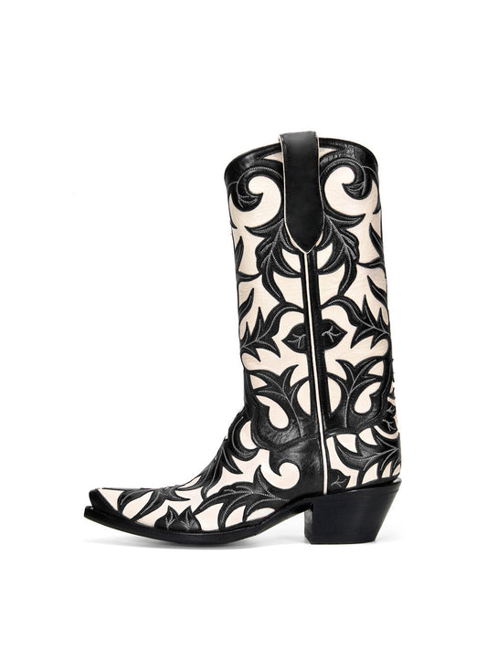 Contrast White And Black Snip-Toe Decorative Inlay Mid Calf Cowgirl Boots