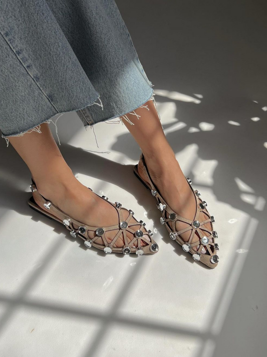 Tan Fishnet Rhinestone Pointy Slingback Flats With Silver Toe Cap