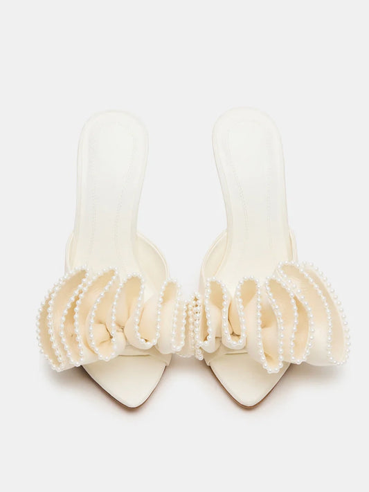 White Satin Round-Toe Backless High Heels With A Large Flower