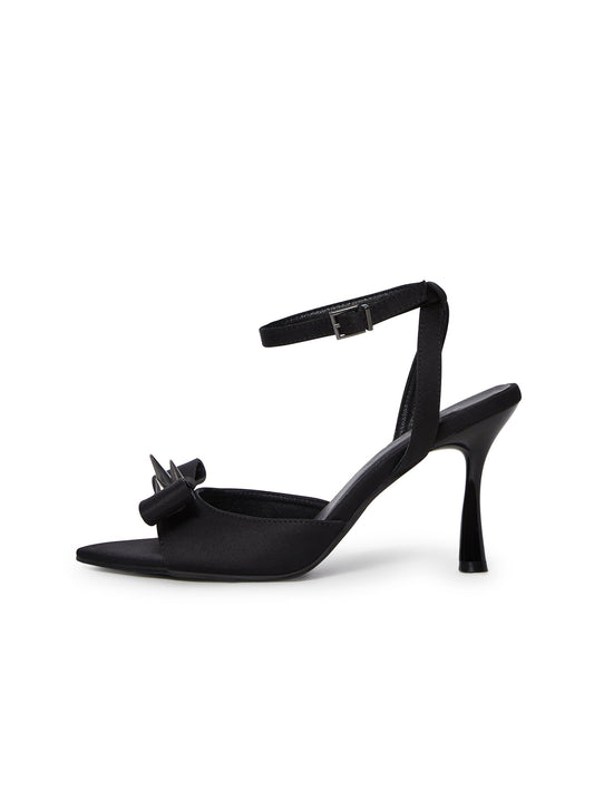 Black Satin Pointed-Toe Front Spiked Bow Ankle Strap High Heels