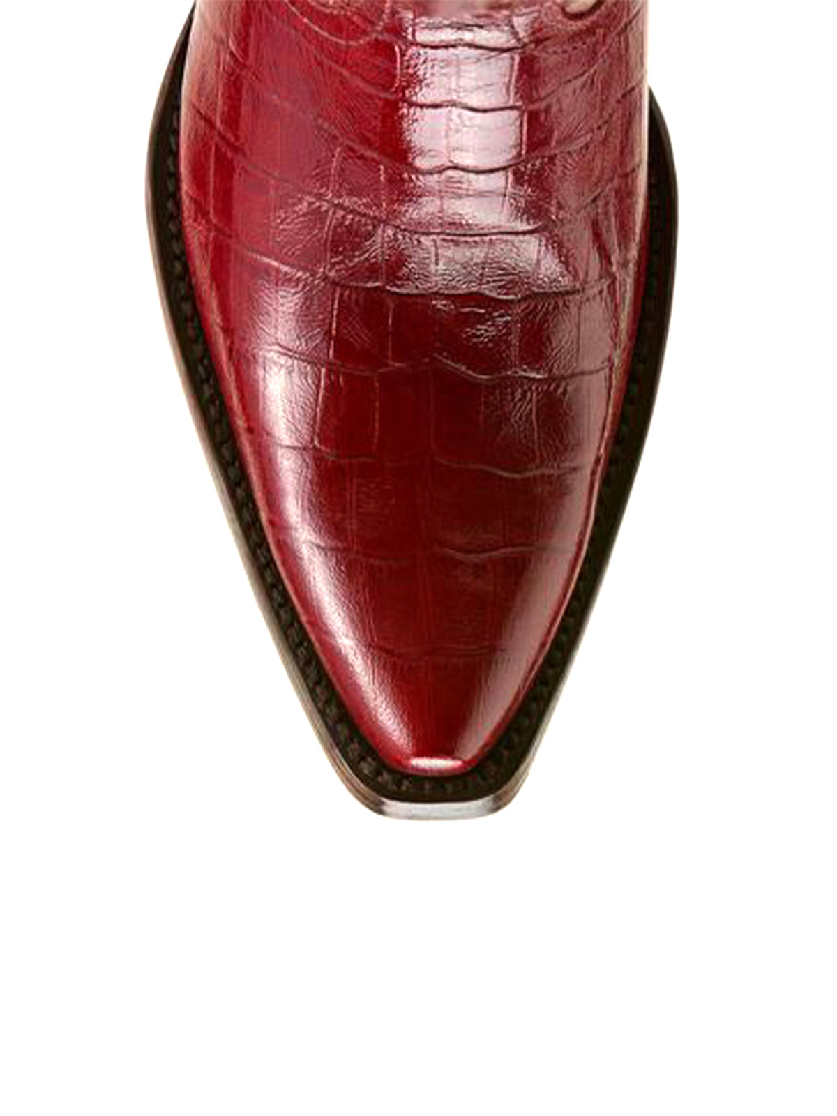 Crafted with a pointed toe and striking Dubonnet crocodile print, they feature a Western-inspired cowgirl design with a knee-high fit. The rich, deep red hue and luxurious texture make them a show-stopping addition to any outfit, ideal for those who dare to stand out with a touch of fierce sophistication.