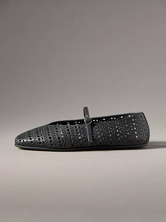 Black Square-Toe Bridge Strap Eyelet Mary Jane Flats