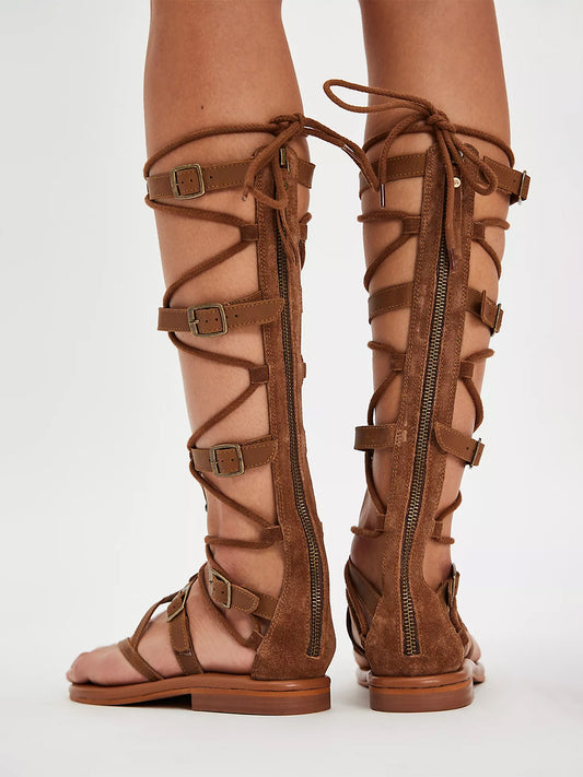 Tan Square-Toe Back Full-Zip Strappy Tall Gladiator Sandals