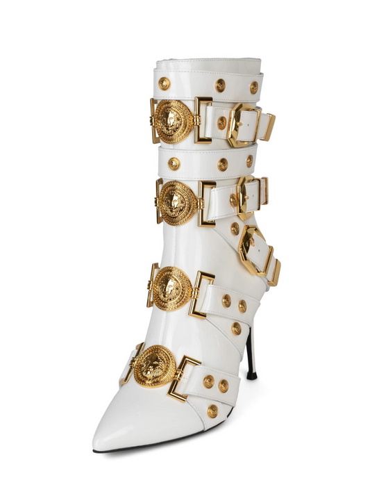 Patent White Pointed-Toe Full-Zip Strappy Buckled Mid Calf Stiletto Boots With Gold Lion Emblems