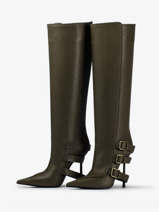 Khaki Pointed-Toe Wide Mid Calf Stiletto Boots With Buckles