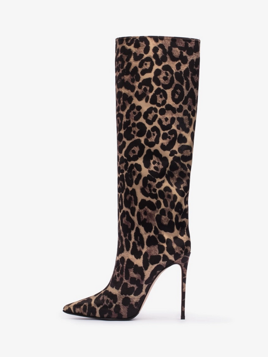 Leopard Cloth Pointed-Toe Wide Mid Calf Stiletto Boots
