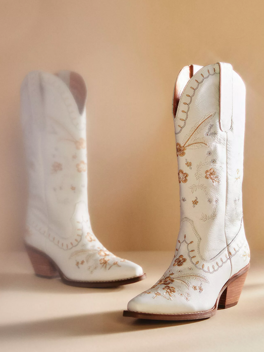 Ivory Snip-Toe Colorful Floral Embroidery Wide Mid Calf Cowgirl Boots