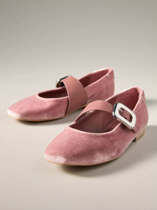 Light Pink Velvet Square-Toe Ballet Wide Bridge Strap Flats