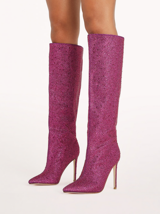 Metallic Fuchsia Pointed-Toe Rhinestone Wide Knee High Stiletto Boots