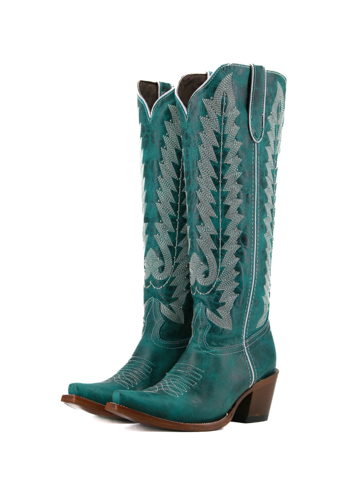 Distressed Teal Green Snip-Toe Half-Zip Classic Embroidery Studded Mid Calf Cowgirl Boots