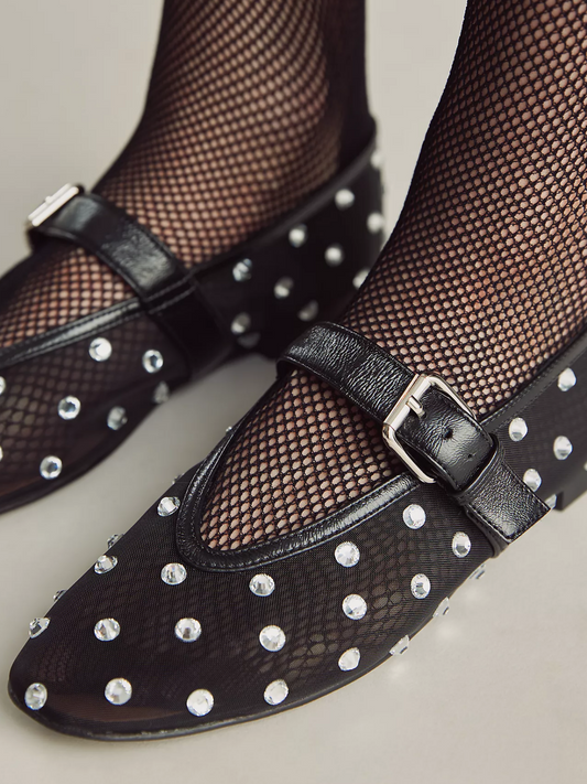 Black Mesh Round-Toe Rhinestone Bridge Strap Ballet Flats