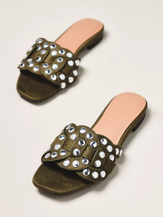 Khaki Faux Suede Square-Toe Studded Slip-On Sandals Flats