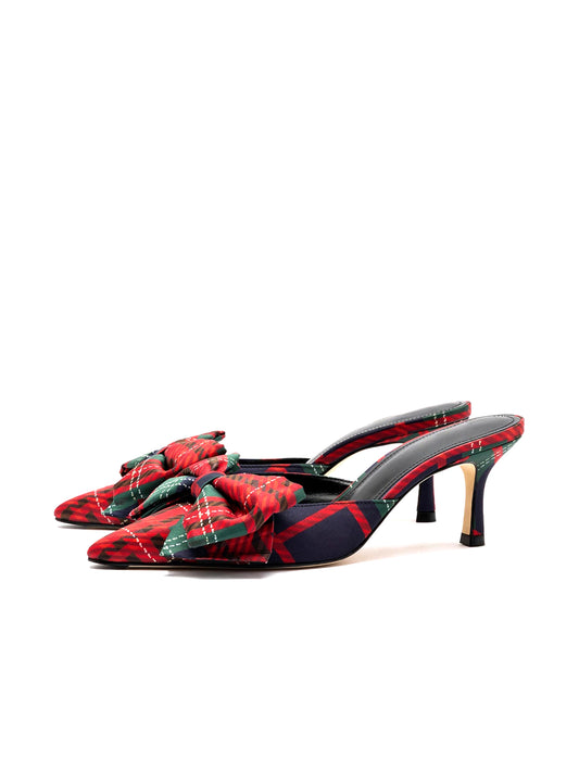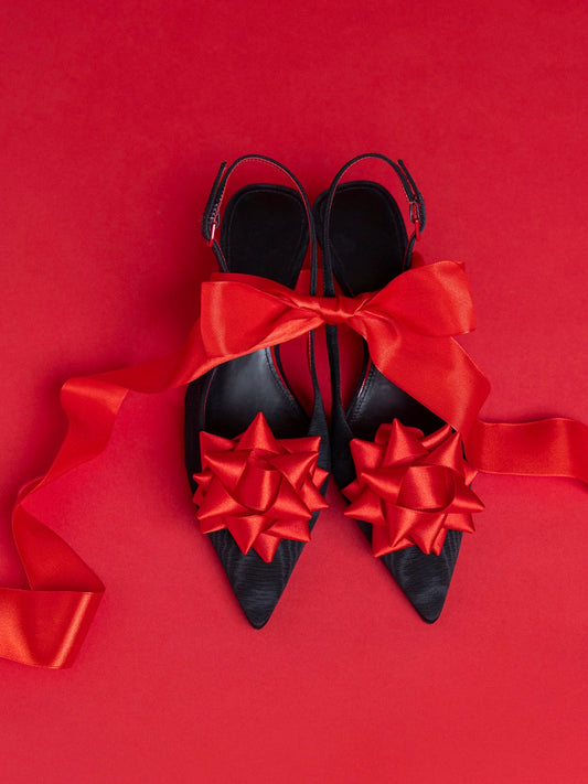 Black Satin Pointed-Toe Front Red Bow Slingback Kitten Heels