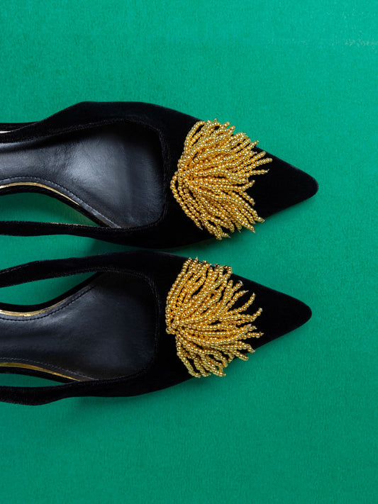 Black Velvet Pointed-Toe Front Beaded Slingback Kitten Heels