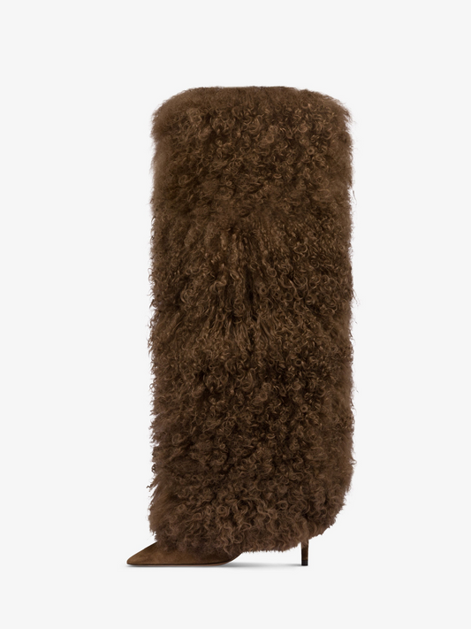 Plush And Faux Suede Pointed-Toe Wide Calf Barrel Shaft Knee High Stiletto Boots - Brown