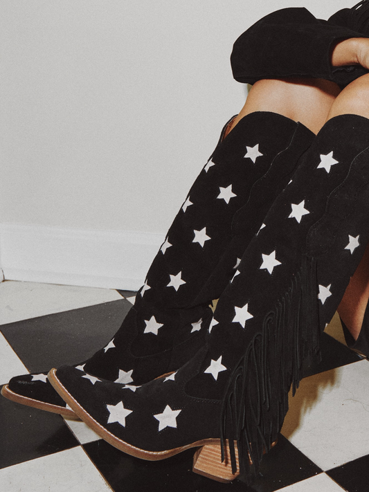 Fringe Faux Suede Snip-Toe Stars Inlay Wide Calf Knee High Cowgirl Boots - Black