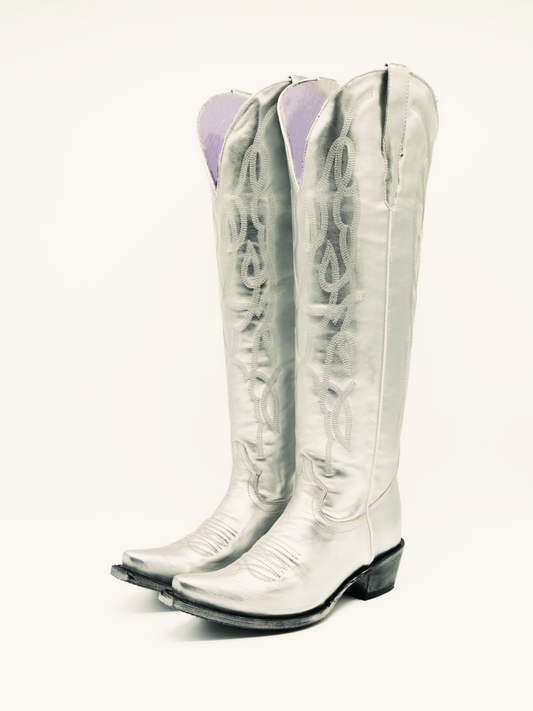 Metallic Silver Embroidery Snip-Toe Wide Calf Western Boots Knee High Tall Boots