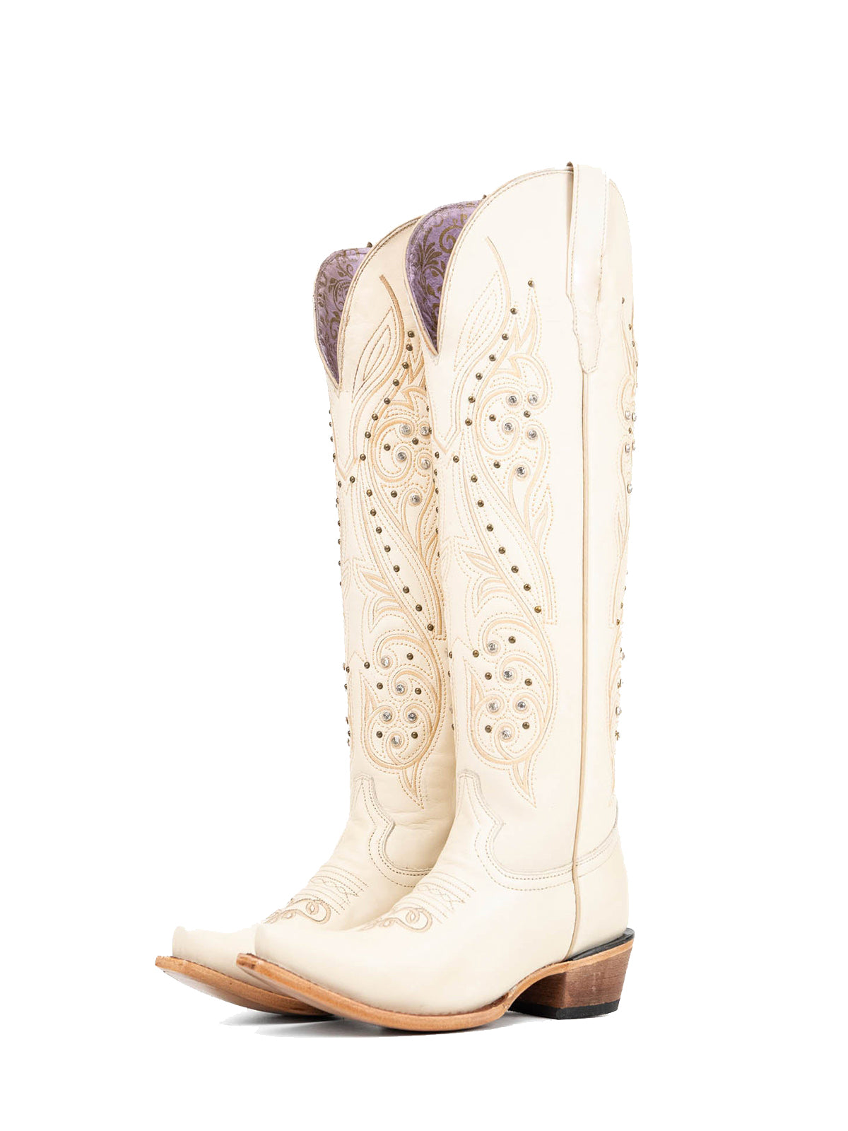 Bone Snip-Toe Half-Zip Embroidery Studded Rhinestone Tall Over-The-Knee Cowgirl Boots