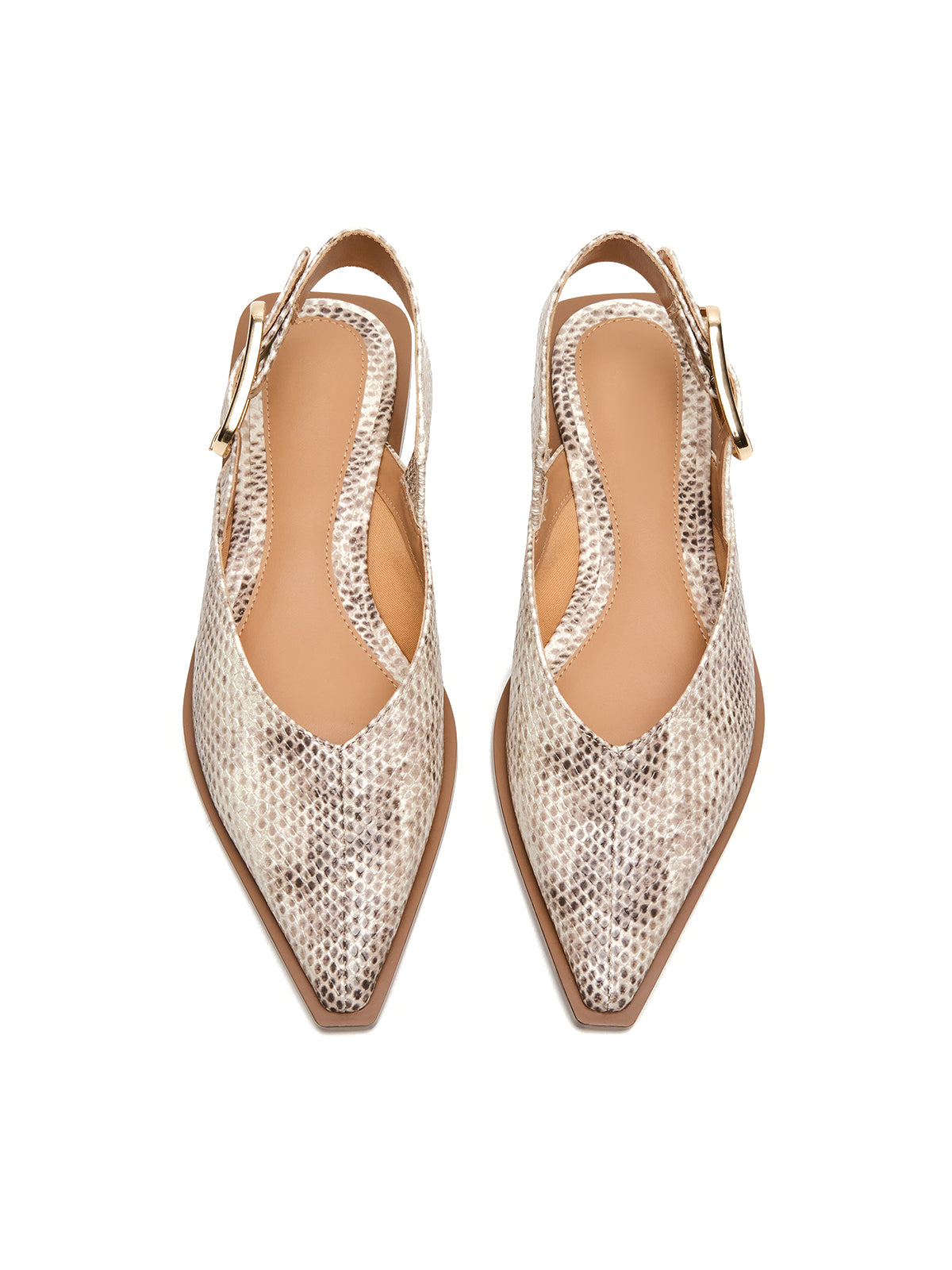 These flats feature a sharp pointed toe and a snakeskin print upper that adds texture and character. The open-back sling design offers easy wear and a light, breathable feel, while the wild tone makes them a versatile choice for everyday styling—effortlessly polished with both casual and dressy outfits.