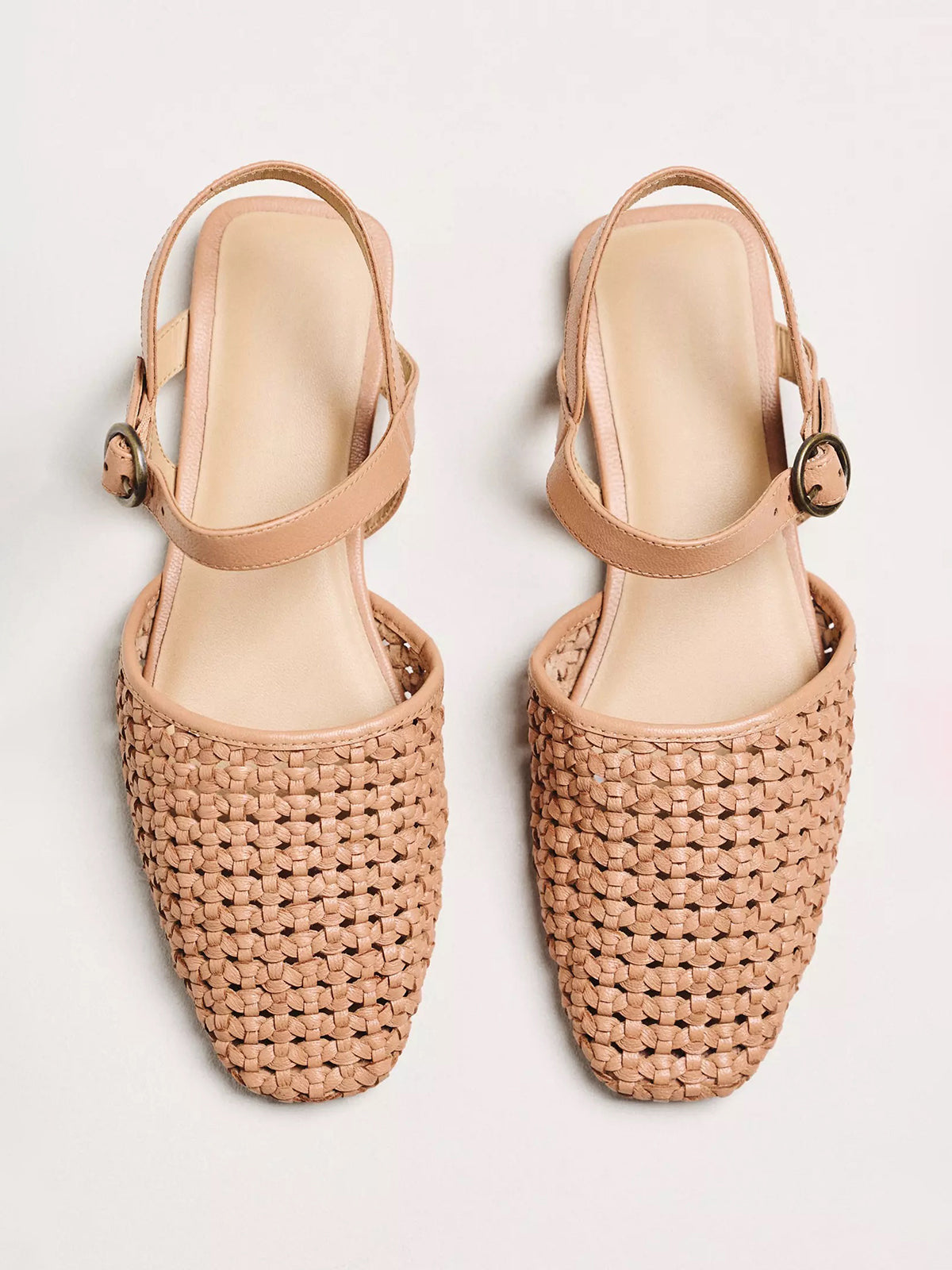 Effortlessly chic, these flats feature a modern square-toe silhouette crafted in woven vegan leather. The intricate weave adds texture and visual interest, while the ankle strap provides a secure, comfortable fit. Finished in a versatile neutral tone, they’re perfect for everyday wear, work looks, or refined casual styling.