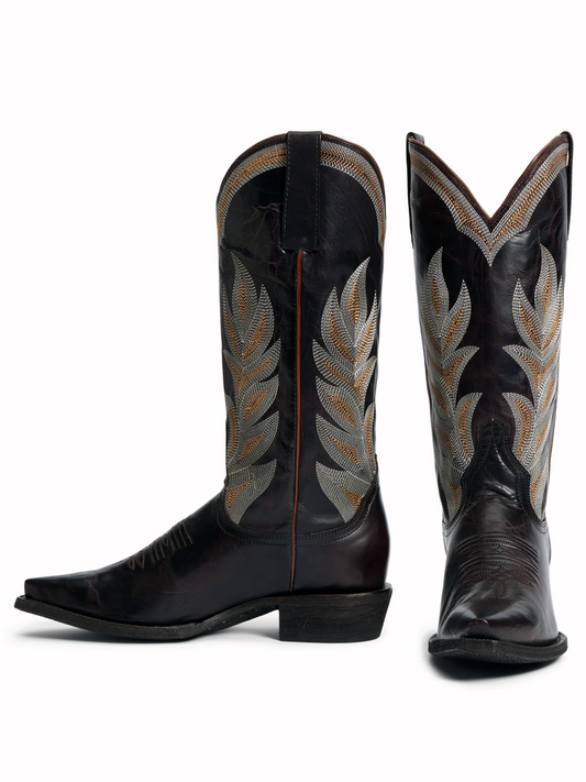 Dark Brown Leaf Embroidery Tall Wide Mid Calf Western Boots For Women
